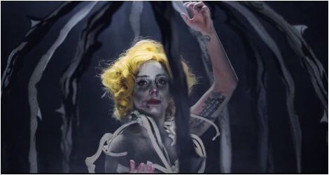 Indeed, one can search the Internet and find dozens of acerbic reviews of the music video, which premiered 48 hours ago (at the time I’m now writing). People are growing tired of Gaga and her antics; to some, she is already old hat. It should also be noted that the tabloids had a field day last fall when Gaga gained 25 pounds. There were hyperbolic claims that her career would be over soon, with one magazine using the sensationalist headline “Lady Gaga Hits Rock Bottom” – a headline that Gaga actually foreshadowed to the letter in her 2010 “Paparazzi” video. It seems as though Gaga, a “slave to our approval,” whose persona is produced as a result of fan devotion, needs her fan base to persist more than ever before. As Ella Bedard, another Gaga Stigmatacontributor, once wrote: “She is only insofar as she exists in the public’s eyes.” A veritable Tinkerbell, Gaga will no longer exist if we stop clapping for her. Therein lies the reason for Gaga’s quest for approbation.